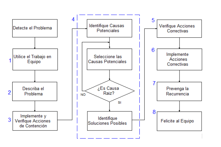Los puntos 1,2,3 se refieren a la detección de los problemas, el punto 4 se refiere al análisis de las causas y finalmente los puntos 5,6,7 y 8 a la implementación de las soluciones.